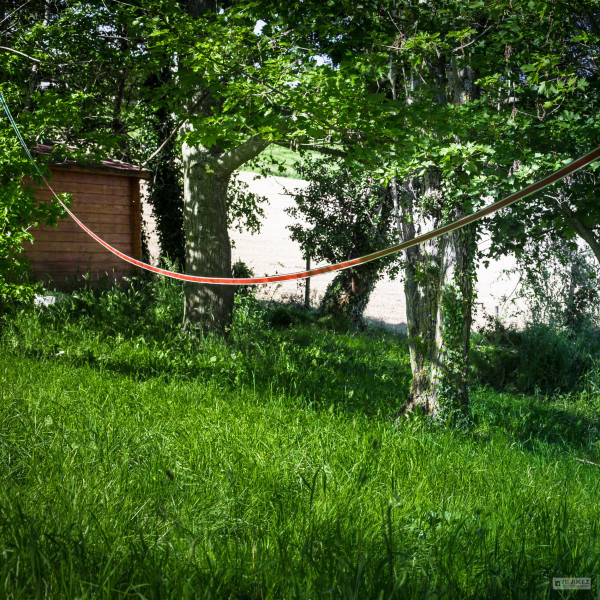 A RODEO line is usually a common 25mm slackline, set-up without any kind of tension. Usually anchored quite high up on both ends, the rodeo-training is an excellent way of training next-level balancing on a slackline.