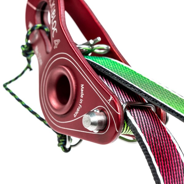 Ce dispositif breveté est destiné à empêcher le glissement de la sangle dans le banana et à améliorer la sécurité de vos installations sur les lignespeu tendues.