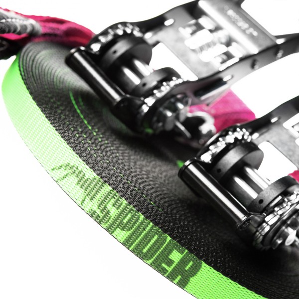 Ta nouvelle Fly line 35 comprend 2 CLIQUETS DE SLACKLINE - HUMMER avec des CALES POUR CLIQUET déjà installés (amovibles) et un sac de transport Slackline.