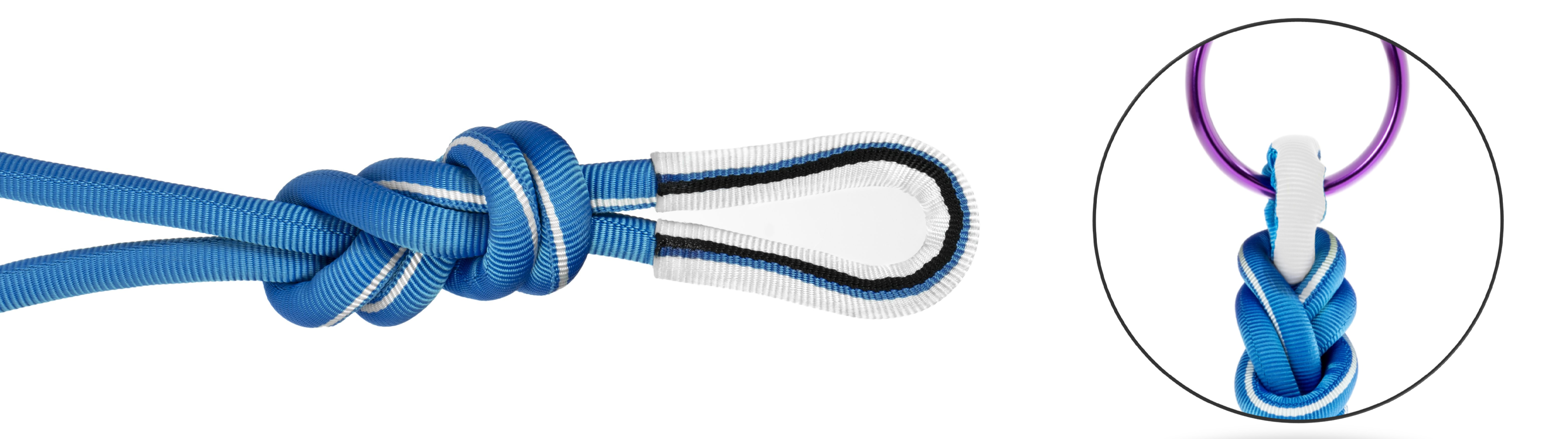 La zone la plus sollicitée du LEASH pendant une chute est la zone de contact avec les anneaux. Pour réduire l'usure, nous suggérons d'ajouter une gaine de protection supplémentaire composée de 20 cm de sangle tubolar.
