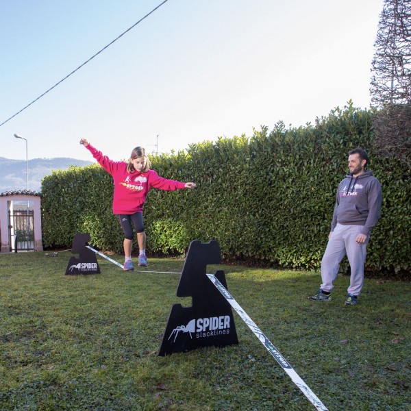 Le Kit Spider OUTDOOR est spécialement conçu pour l'usage en extérieur. Tu peux facilement ancrer la platine au sol et ajuster la ligne à trois hauteurs différentes, à l'aide d'un A-Frame.