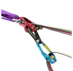 Il sistema KEY-LOCK permette di non impigliarsi in materiali tessili come la fettuccia o la corda nel momento in cui si apre o si chiude la leva.